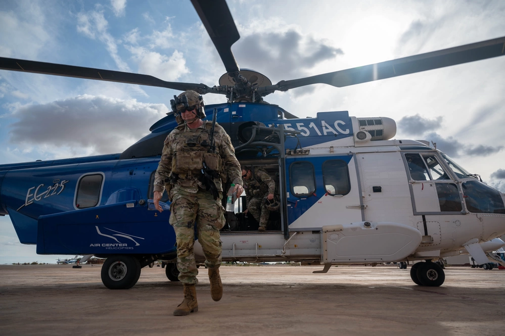 El teniente general Jonathan Braga baja de un helicóptero Eurocopter EC225LP de la empresa Vertical Aviation No 1 en la base 101 en Niamey. Foto: Amy Younger vía DVIDS.