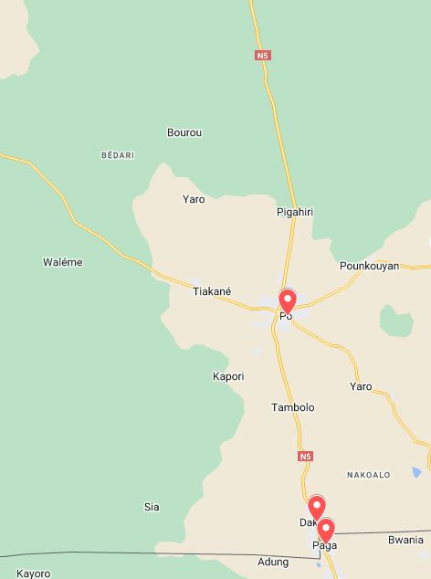 Los tres lugares identificados en la publicación original (Paga, Dakola y Po) corresponden a localidades cerca de la frontera entre Ghana y Burkina Faso, siguiendo la ruta nacional 10 en Ghana y luego la ruta nacional 5 en Burkina Faso.