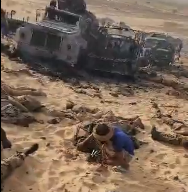 Tres vídeos con imágenes bastante explícitas (vídeo 1, vídeo 2 y vídeo 3) muestran decenas de cadáveres de fuerzas gubernamentales al lado de un vehículo blindado MRAP de origen chino NORINCO VP11 y varios todoterrenos surcoreanos KM450, tal como se aprecia en los siguiente fotogramas.