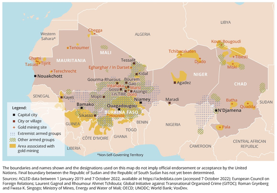 Zonas de extracción de oro y presencia de grupos armados. Fuente: UNODC TOCTA Sahel.
