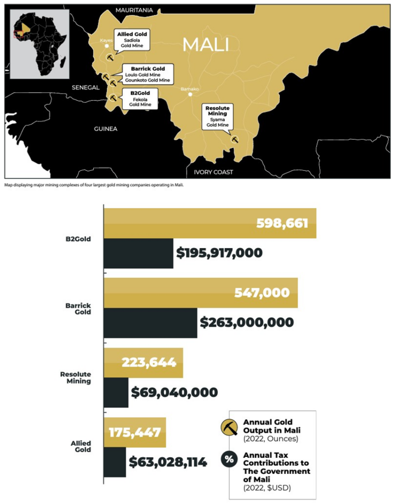 Mapa que muestra los principales complejos mineros de las cuatro mayores empresas de extracción de oro que operan en Malí. Fuente: The Blood Gold Report
