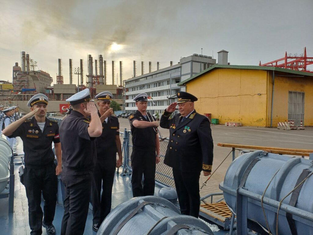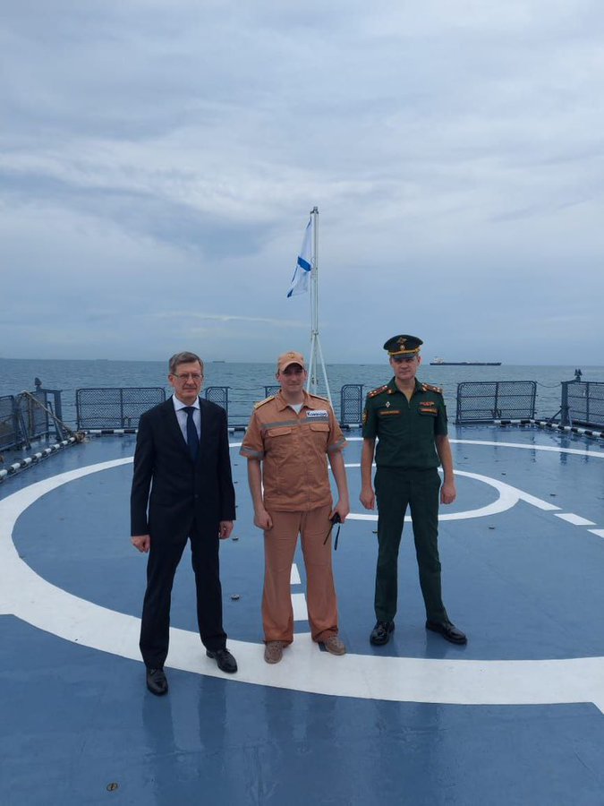 El Embajador y el agregado militar de Rusia en Nigeria a bordo de la corbeta Boikiy frente al puerto de Lagos. Foto: Embajada de Rusia en Nigeria.