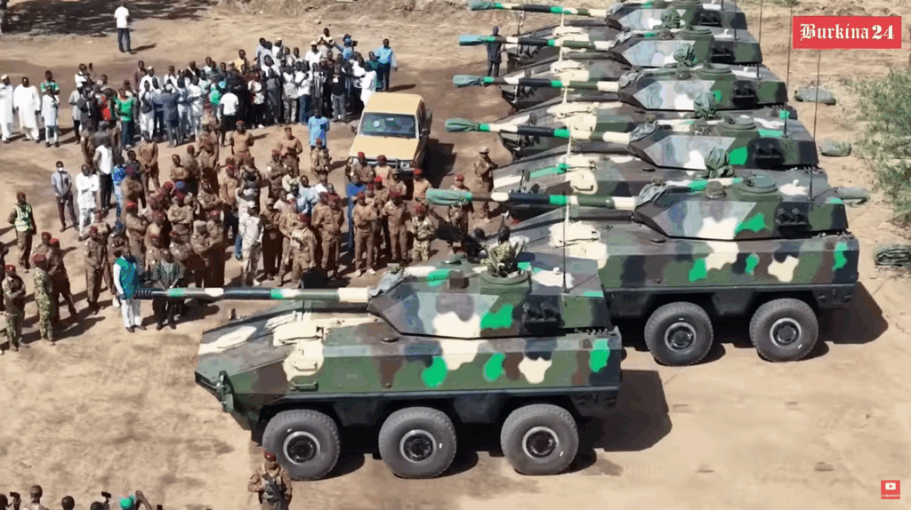 El ejército de Burkina Faso presentó en esta ocasión seis vehículos de apoyo de fuego VN22B. Se trata de la nueva generación de vehículos 6×6 de NORINCO para los mercados de exportación. En OSINT Sahel ya informamos de la llegada de vehículos VN22 a Burkina Faso en 2024, que según la base de datos de transferencias de armas del Instituto Internacional de Estudios para la Paz de Estocolmo fueron 16 en la variante de transporte de personal. El vehículo VN22B cuenta con una torre con cañón de 105mm.