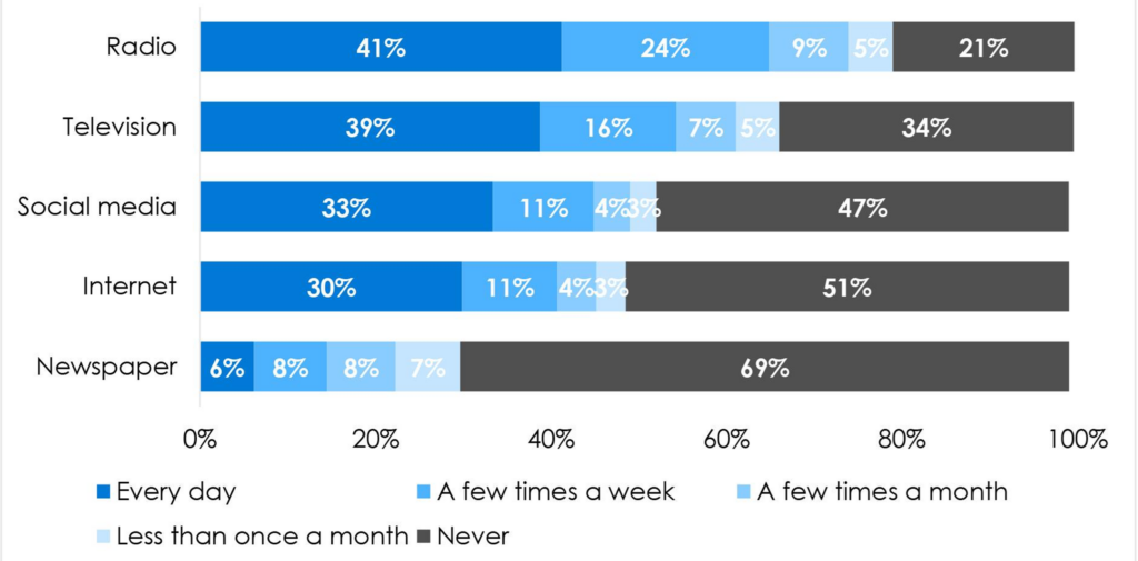 Un grupo de investigación con sede en Accra, Ghana, cuyos hallazgos se publican en la red de investigación Afrobarómetro, han recopilado datos en 34 países africanos durante la última década explicando que la radio sigue siendo el principal medio de información en África, ya que alrededor del 68% de las personas la escucha varias veces a la semana, frente a porcentajes mucho menores de uso de internet y computadoras, especialmente visibles durante el cierre de escuelas por la pandemia de COVID‑19, cuando muchos estudiantes dependieron de radios solares para seguir sus clases en casa. Más del 80% de la población posee un teléfono móvil con red, pero menos de la mitad dispone de acceso a internet en ese dispositivo, lo que mantiene a la radio —incluida su integración creciente con móviles y emisiones en lenguas locales— como el medio más confiable y accesible para la ciudadanía africana.