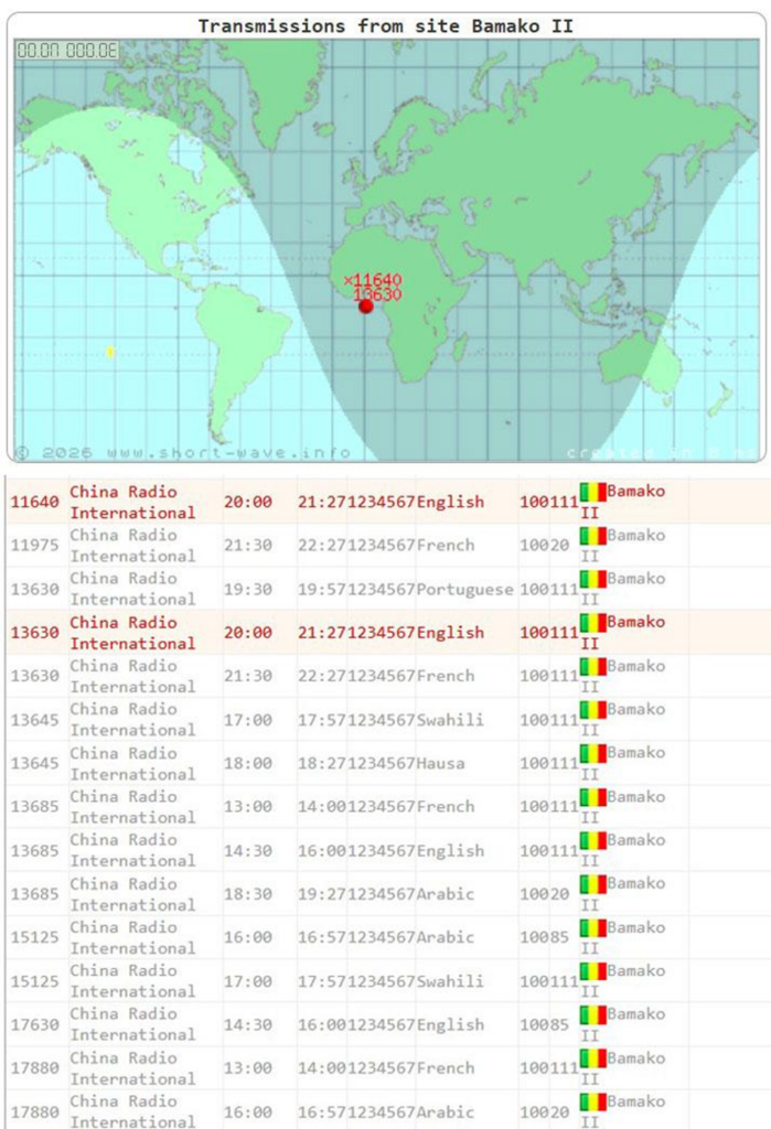 Radioaficionados reportan emisiones potentes de RCI desde allí en frecuencias como 5995 kHz o 11640 kHz, con bearing aproximado de 188° hacia audiencias africanas, consolidando esta alianza como ejemplo de «poder blando» chino en el Sahel. Hoy podemos captar fácilmente con una radio económica (15 euros) toda la programación de RCI desde el transmisor Bamako II emitiendo con claridad.