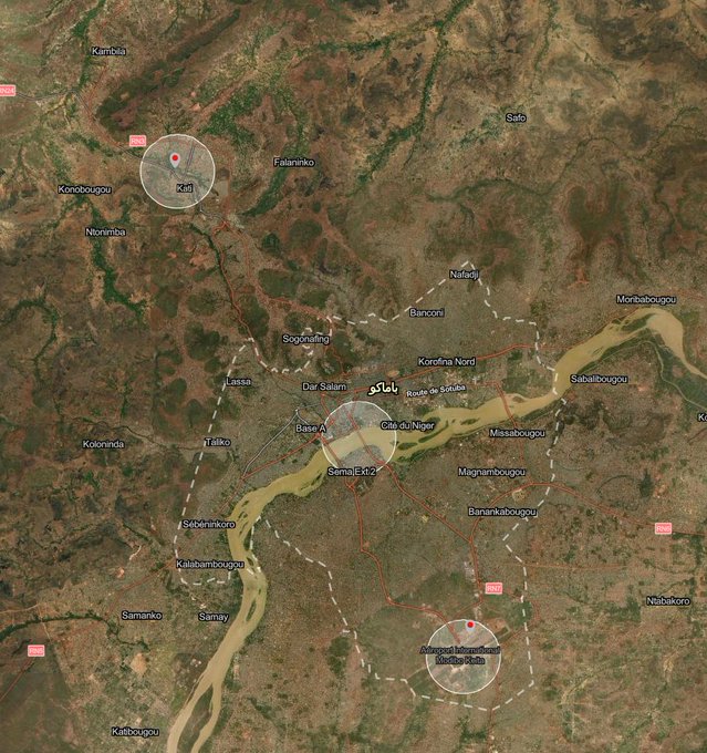 Mapa de Bamako. Al norte la localidad de Kati. Al sur el aeropuerto. Fuente: @aliuf en X.com