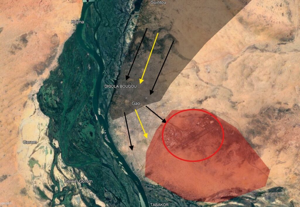 Como vimos, desde primera hora el portavoz del FLA anunció el avance de la organización hacia la ciudad de Gao. Una posición gubernamental fue tomada en la entrada de la ciudad, al lado de la Ruta Nacional 18, que erróneamente fue ubicada previamente en la ciudad de Bourem. Otros vídeos mostraron a los insurgentes del FLA circulando a toda velocidad por avenidas de Gao, la sexta ciudad del país por población. Desde la comunidad OSINT de la red social X.com se confirmó que los vídeos mostraban el interior de la ciudad de Gao.