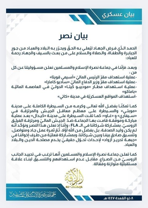 A última hora de la tarde del día 25 de abril el JNIM emitió un comunicado donde reconocía haber operado en coordinación con el FLA. Y revindicaba los ataques contra la residencia del presidente del país, la residencia del ministro de defensa, el aeropuerto de Bamako y objetivos militares en la ciudad de Kati. Además el comunicado afirmaba que la ofensiva había permitido tomar el control de las ciudades de Mopti y Kidal. además de la “la mayoría de los bastiones del ejército y los mercenarios en Sévaré y Gao”. El comunicado llamaba a Rusia a mantener sus fuerzas al margen de los combates, ofreciendo a cambio no atacar las bases con personal ruso no fueran atacadas.